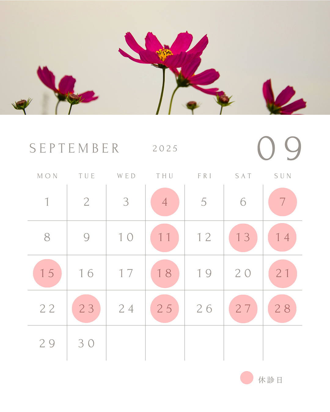 9月は15日(月)、 23(火)は祝日の為休診となります🙇♀️